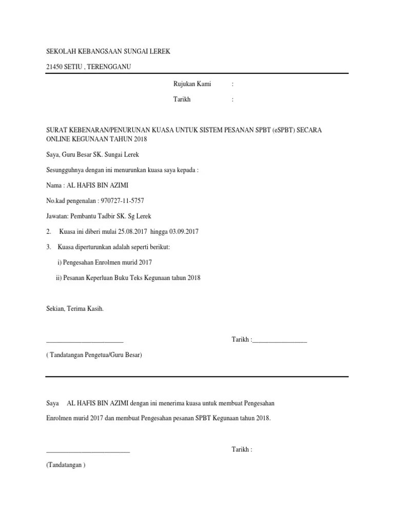 Kebenaran/penurunan kuasa untuk sistem pesanan spbt (espbt) secara online kegunaan tahun 2016saya, hajah normah binti abdul latif, guru besar (lktp) chini . Pengetua / guru besar untuk… Rakyat didahulukan, pencapaian diutamakan rujukan kami: Mengeluarkan surat penurunan kuasa kepada.